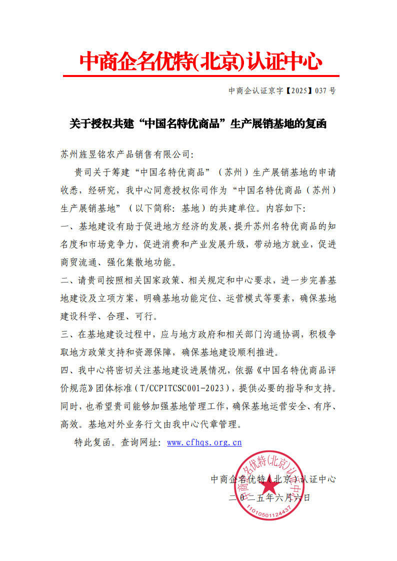 关于授权共建“中国名特优商品”生产展销基地的复函